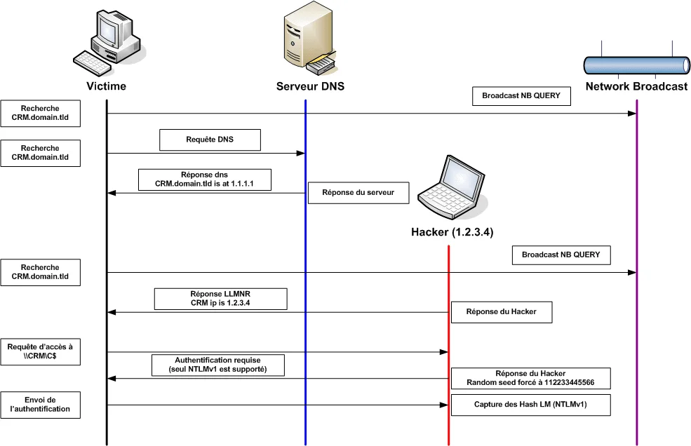 Le but de l’attaque est de répondre aux différentes requêtes LLMNR des stations clientes en indiquant l’adresse IP de l’attaquant comme propriétaire du nom recherché.